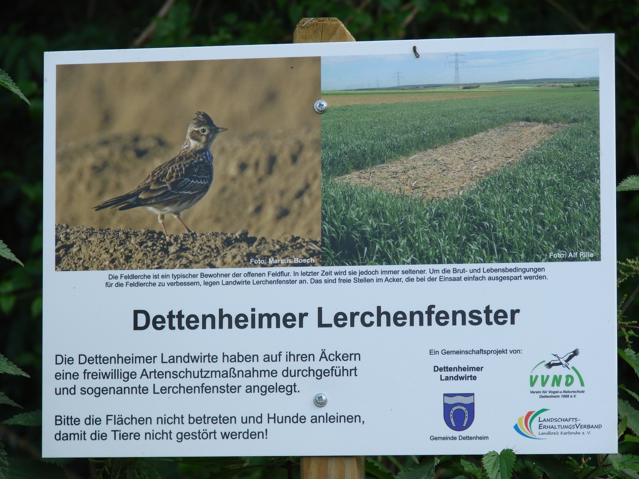 Am vergangenen Donnerstag den 21.05.2015 trafen sich Vertreter des Vereins für Vogel- und Naturschutz Dettenheim, des Landschaftserhaltungsverbands des Landkreises Karlsruhe einige "Dettenheimer Landwirte" und Frau Bürgermeisterin Ute Göbelbecker am Rathaus. Dettenheimer Landwirte haben auf ihren Äckern eine freiwillige Artenschutzmaßnahme durchgeführt und sogenannte Lerchenfenster angelegt. Siehe Bericht des Bauernverbandes im Dettenheimer Anzeiger von 16.Mai 2015. Grund des Zusammentreffen der oben angeführten Vertreter war das Anbringen von INFO Tafeln in der Dettenheimer Gemarkung. Durch diese Maßnahme erhoffen sich die Beteiligten dass die Lerche künftig wieder öfters auf den Feldern zu sehen und zu hören sein wird. Die angebrachten INFO Tafeln stehen nicht an den Äckern an welchen die Lerchenfenster angelegt sind. Sollten sie die Lerchenfenster erkennen, betreten sie bitte diese Flächen nicht um die Tiere bei Brut und Aufzucht zu stören.